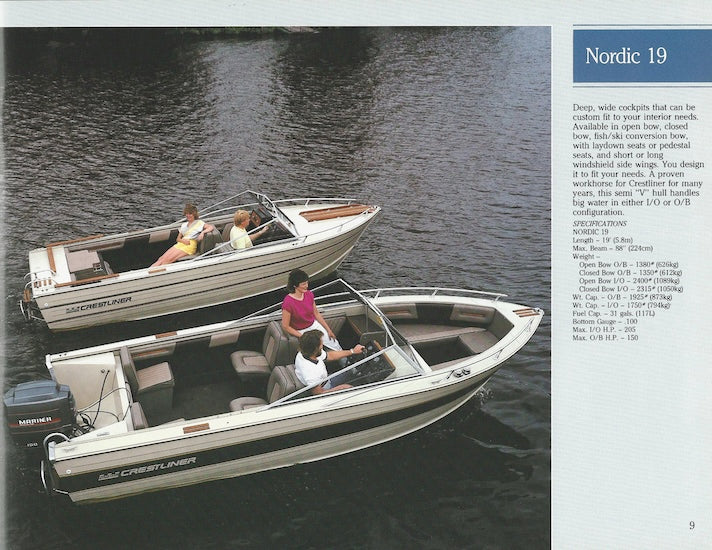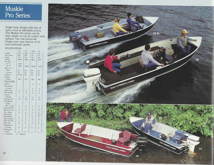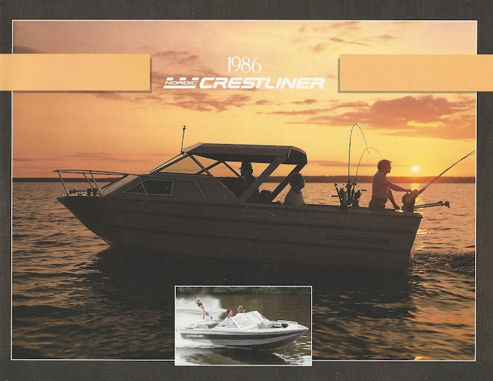 Brochure Covers: Crestliner Sabre, Nordic, Sportfish, Phantom, Mirage, Northstar, Fish Hawk, Viking, Super Hawk, Muskie, Elite, Ensign, Crusader, Angler, Apollo Series