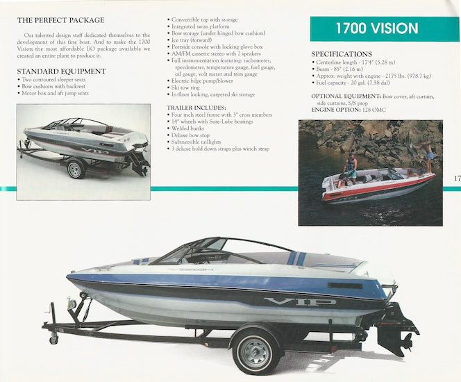 Brochure Covers: VIP 171FFB, 171 Bassliner, 150, 190T, 85, 125, Fish & Ski 162, 179, 183, 190, 192, Center Console 180, 210, 230, 250, Walkaround 236, 266, Valiant 1850, Vision 1700, 1750, Viscount 1950, Vantage 1850, Valiant 1850, Victory 1960, Vixen 2000, Volante 2300, Vincente 2350, 2700SC, Vindicator 1900, 2000, 2300 & 3000